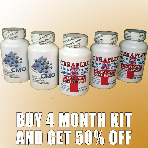 CMO contains a naturally associated group of fatty acids derived from beef tallow and magnesium chelate.CMO 60 capsule bottles contain 770 mg hard shell gelatin capsules filled with a cis-9-cetylmyristoleate rich natural beef tallow extract that has been blended with magnesium chelate and silica.Ceraflex was formulated by Dr. Sands as the perfect follow up supplement for CMO. It has a large 1500mg dose of glucosamine and a low 100mg dose of CMO with 190mg of calcium. Ideal for use as daily joint support as a follow up for CMO.